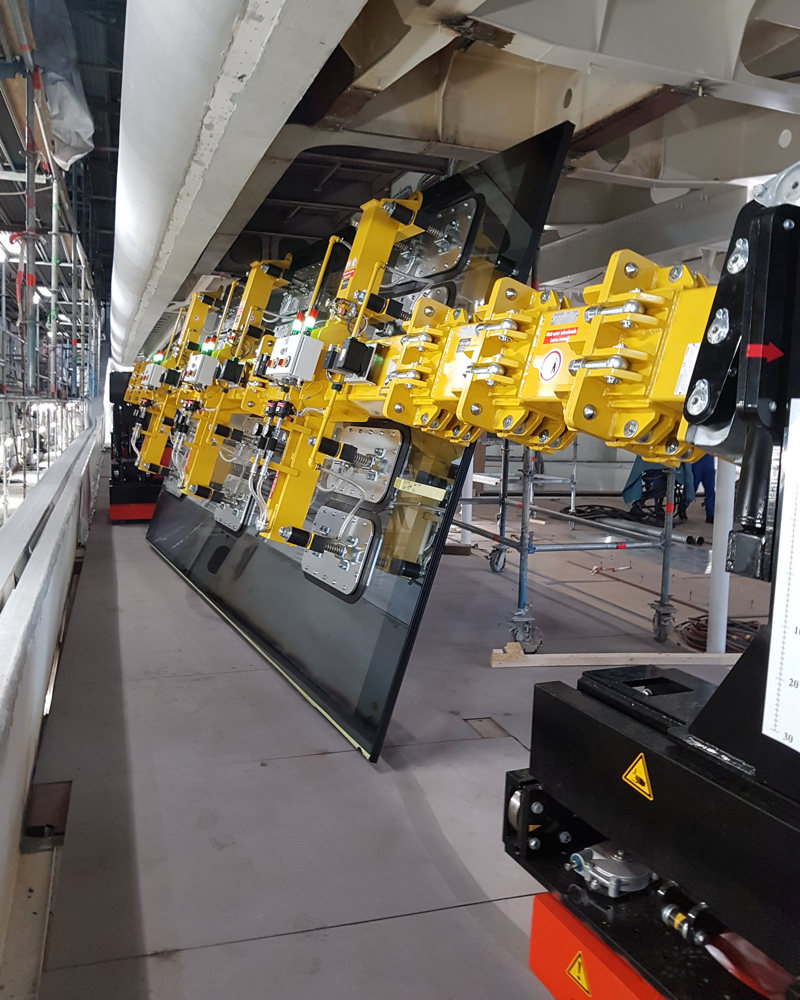 The Glasboy 5300 is a special design for glazing extremely heavy glass panes. In our photo above, you can see 1 glass pane with a length of over 11000 cm and a height of approx. 3000 cm.